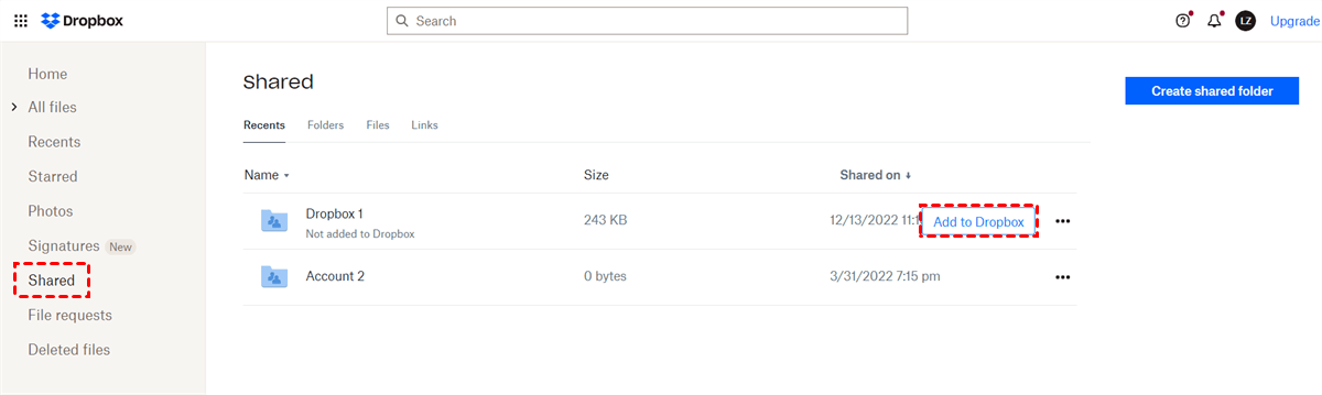 Step 6. Click “Add to Dropbox” beside the shared folder on the Shared page. Then you can move files from and to the shared folder.