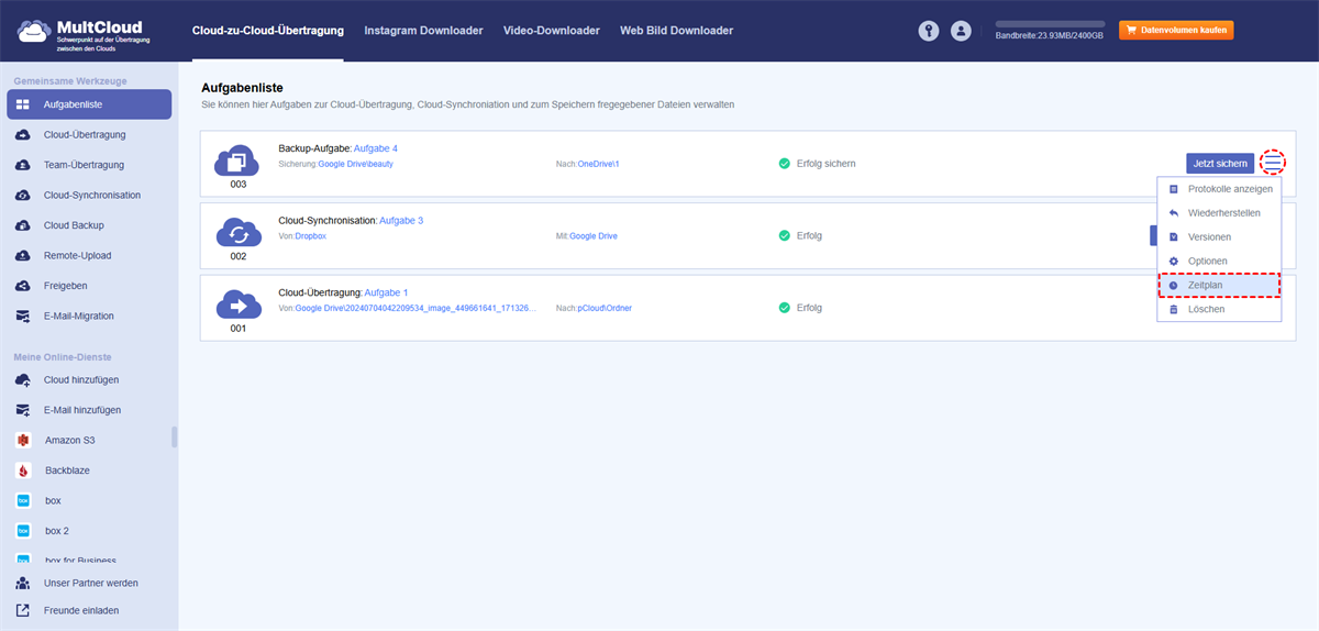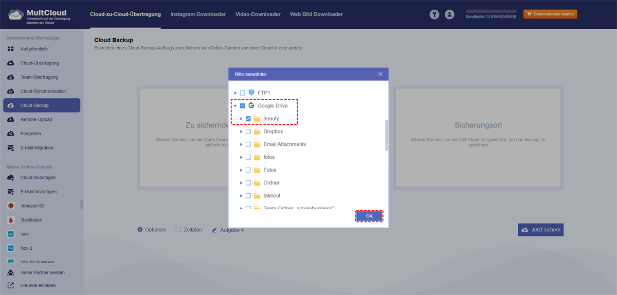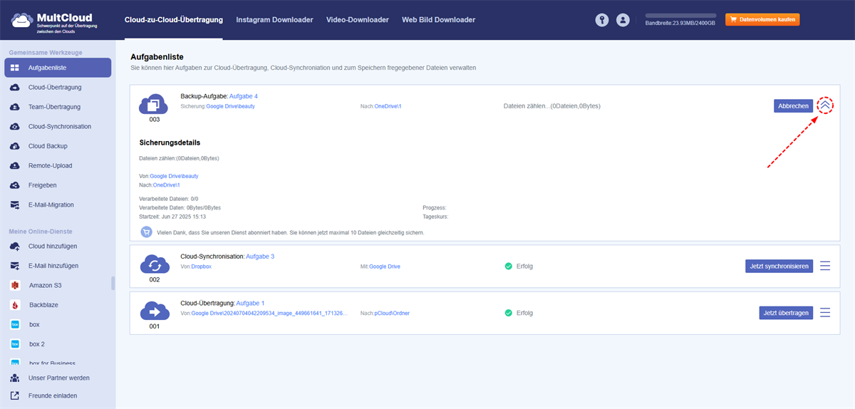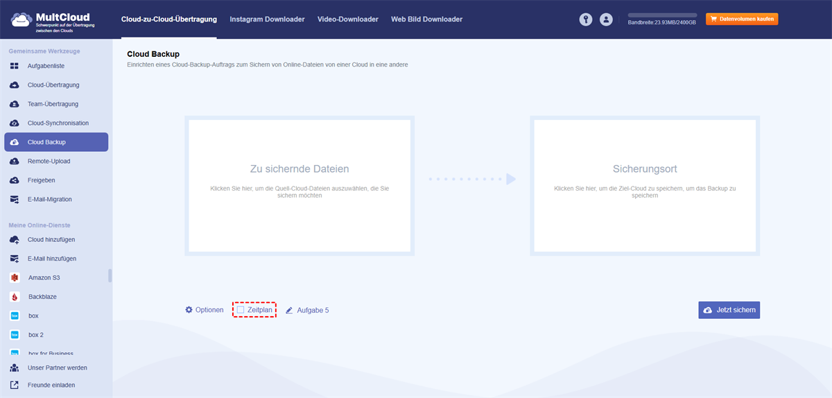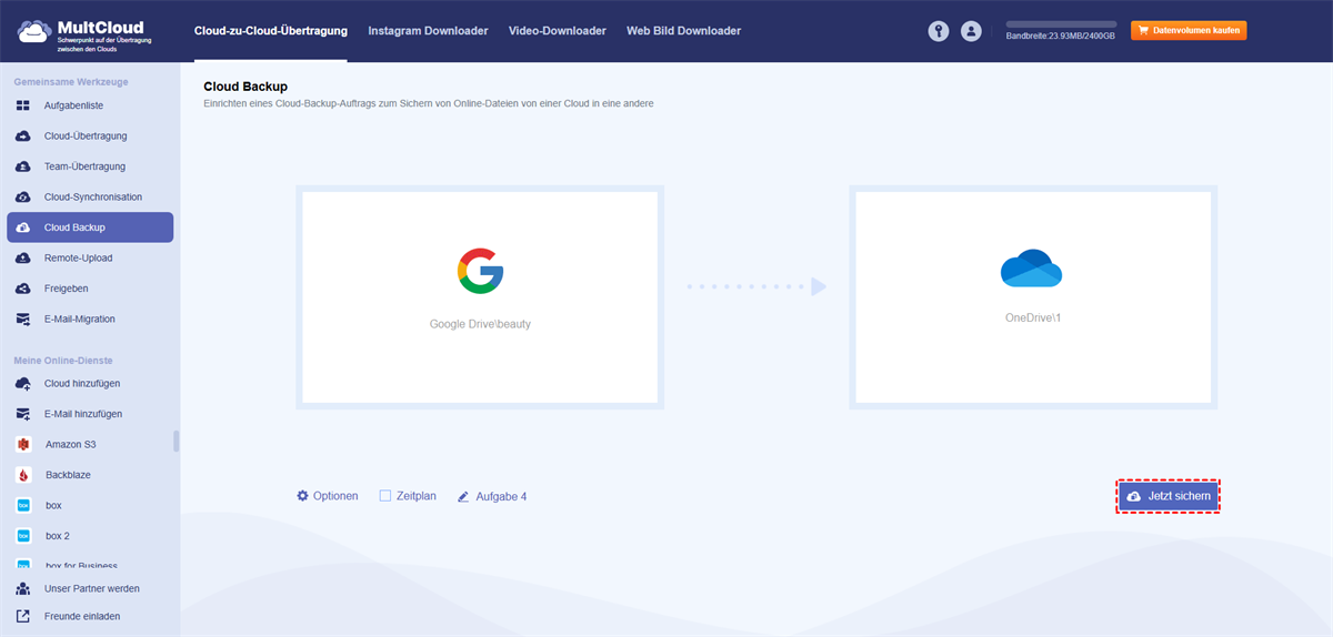 Mit der Cloud-Backup-Funktion können Sie Ihre Daten von einer Cloud in eine andere sichern, um Datenverlust zu vermeiden. Sollten Daten verloren gehen, können Sie die Originaldaten problemlos aus der Ziel-Cloud wiederherstellen.