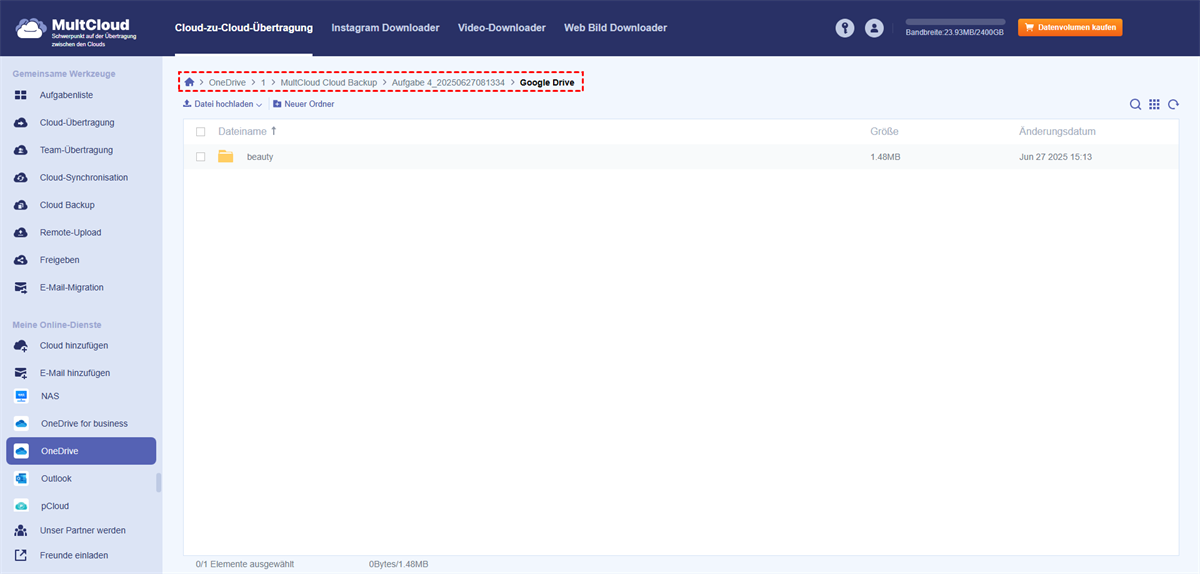 Nach Abschluss der Sicherung wird der Ordner „MultCloud Cloud Backup“ unter dem von Ihnen ausgewählten Zielverzeichnis angezeigt. Anschließend wird unter dem Ordner der Ordner „Aufgabenname_Sicherungsdatum“ zum Speichern der Sicherungsdaten erstellt.