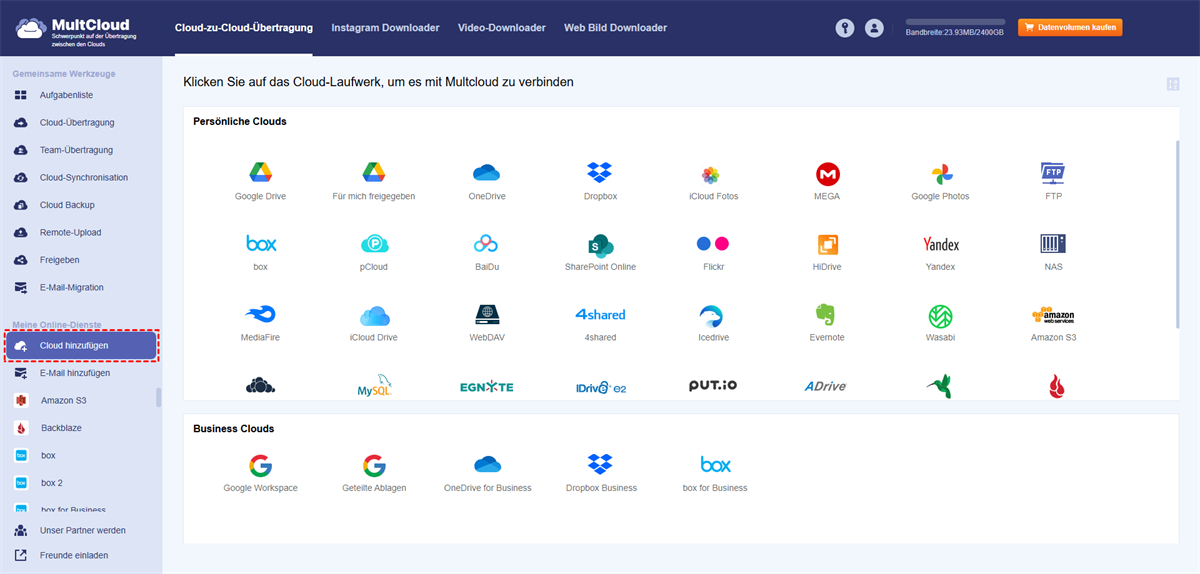 Schritt 2: Fügen Sie die Cloud-Dienste hinzu, die Sie zum Übertragen von Daten benötigen, indem Sie auf „Cloud hinzufügen“ klicken. Wählen Sie sie aus und folgen Sie den Anweisungen, um sie nacheinander zu Ihrem MultCloud-Konto hinzuzufügen.