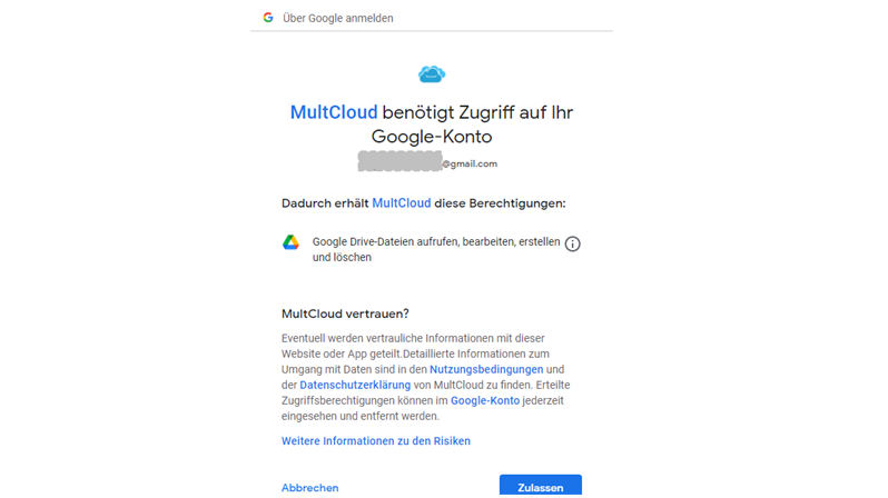Schritt 3. Wählen Sie ein Konto, das Sie zu MultCloud hinzufügen möchten und erlauben Sie MultCloud den Zugriff auf Ihr Google-Konto. Folgen Sie dann demselben Prozess, um auch Ihr zweites Konto zu MultCloud hinzuzufügen.