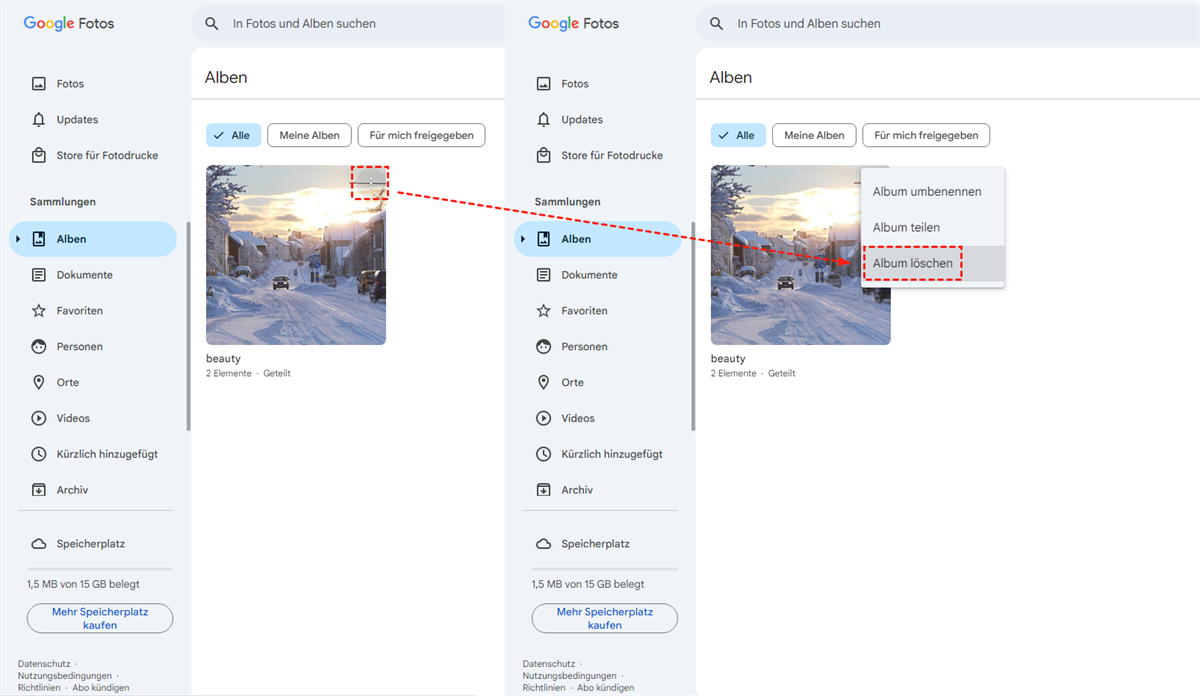 Schritt 4: Löschen Sie das erste Album, indem Sie oben rechts auf das Symbol mit den drei Punkten tippen, um Album löschen auszuwählen.