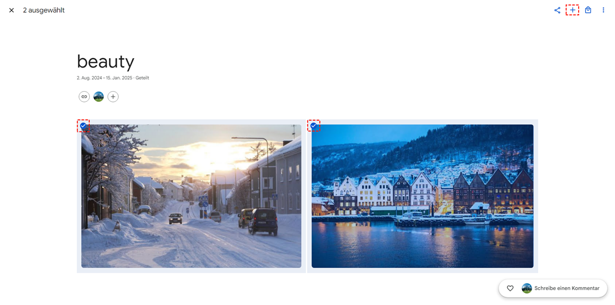 Schritt 2: Gehen Sie zu einem Album, das Sie zusammenführen möchten, und wählen Sie das/die Foto(s) aus, indem Sie das Häkchen oben links aktivieren. Klicken Sie dann auf das Plus-Symbol in der rechten oberen Ecke.