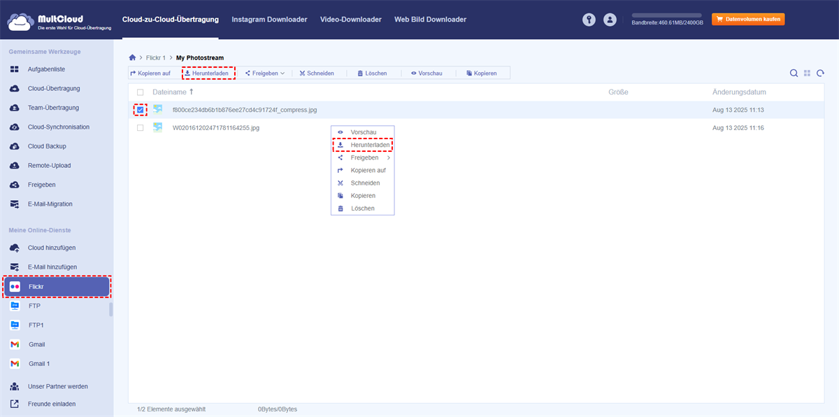 Wenn Sie Probleme haben, alle Fotos auf der Flickr-Website herunterzuladen, können Sie alternativ einen Drittanbieterdienst nutzen. MultCloud, ein kostenloser Cloud-Speicher-Manager, kann dabei in Betracht gezogen werden. Flickr ist eine der von MultCloud unterstützten Clouds und Sie können Flickr-Fotos von der Website herunterladen.