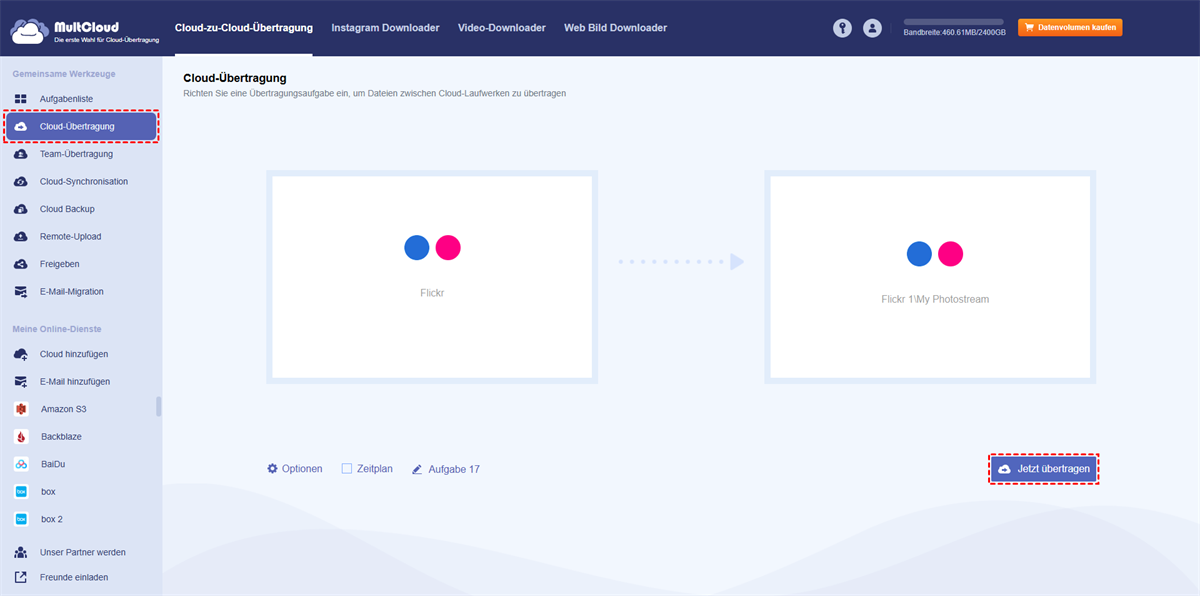 Wenn Sie alle Fotos von einem Flickr-Konto auf ein anderes Konto oder in eine andere Cloud übertragen möchten, ist MultCloud eine große Hilfe, da die Cloud-Übertragung-Funktion diesen Übertragungsvorgang automatisiert.