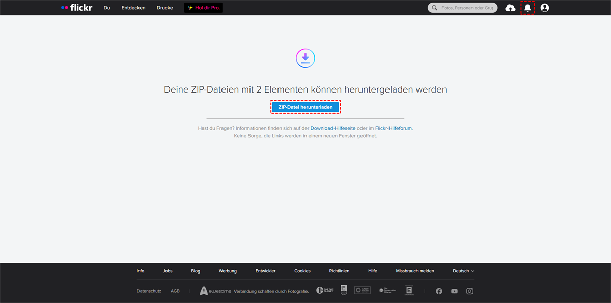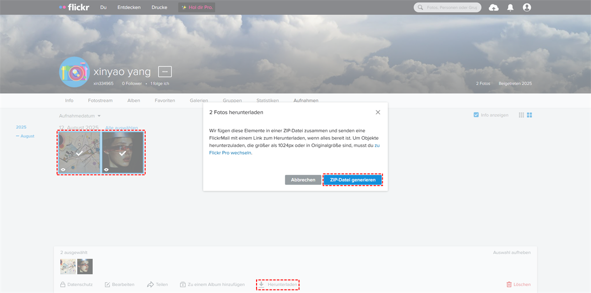 Hinweis: Flickr erlaubt es nur, 500 Fotos auf einmal herunterzuladen. Wenn Sie mehr Fotos haben, müssen Sie diese möglicherweise aufteilen und die Schritte mehrmals wiederholen.