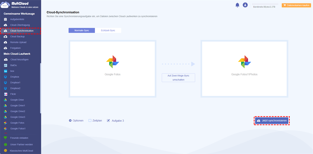 Schritt 3. Teilen Sie das Google Fotos-Konto mit einem anderen Konto mit „Cloud-Synchronisation”. Wählen Sie das Verzeichnis unter einem Google Fotos als Quelle, wählen Sie das Verzeichnis unter einem anderen Google Fotos als Ziel, klicken Sie auf „Jetzt synchronisieren” und warten Sie, bis der Vorgang abgeschlossen ist.