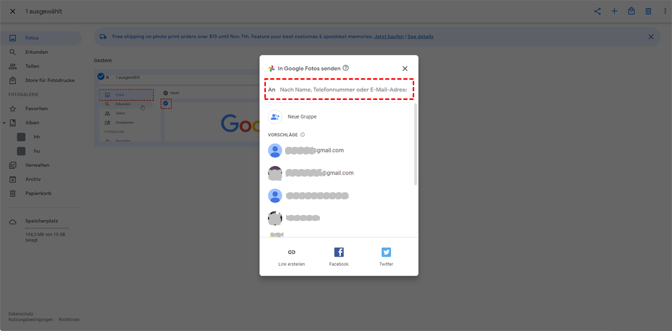 Dies ist der herkömmliche Weg, um alle Google Fotos mit jemandem zu teilen, indem Sie die Funktion „Freigeben” von Google Fotos verwenden. Auf diese Weise können Sie alle Ihre Google-Fotos ganz einfach für ein anderes Konto freigeben, aber Sie haben vielleicht festgestellt, dass Sie die Seite nicht schließen können, bis diese Fotos vollständig an ein anderes Konto gesendet wurden.