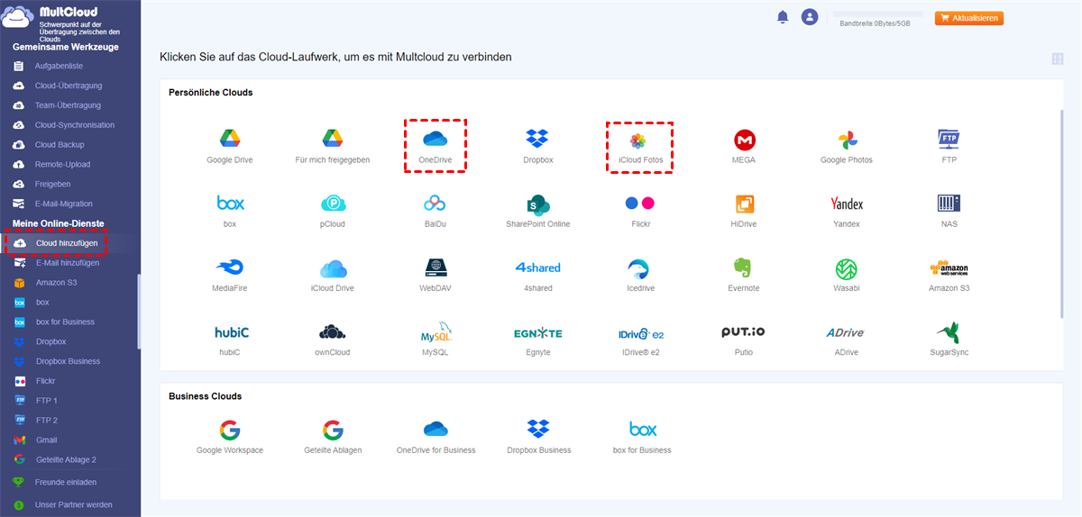 Daher können Sie mithilfe von MultCloud iCloud-Fotos problemlos auf andere Cloud-Konten verschieben. In diesem Artikel wird das Verschieben von iCloud-Fotos auf OneDrive als Beispiel verwendet.