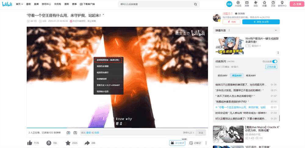 1. Rufen Sie die Bilibili-Website auf und öffnen Sie das Video, das Sie herunterladen möchten. Kopieren Sie den Bilibili-Videolink aus der Adressleiste. Alternativ können Sie mit der rechten Maustaste auf das Video klicken und „Videolink kopieren“ (复制视频链接(精准空降)) auswählen.