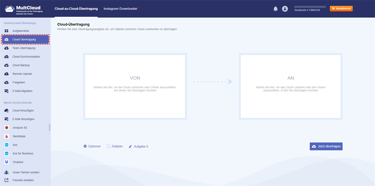 - Dateien zwischen Clouds übertragen: Derzeit haben die einzelnen Cloud-Anbieter keine neue Funktion entwickelt, um Dateien direkt von einem Laufwerk auf ein anderes zu übertragen. Wenn Sie Dateien direkt zwischen den Clouds übertragen möchten, anstatt den mühsamen Weg des Herunterladens und erneuten Hochladens zu gehen, sollten Sie alle Cloud-Speicher zu einem zusammenfassen.