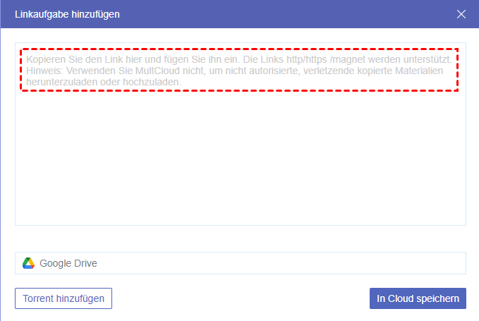 Geben Sie den URL-Link der Zieldatei in das Fenster ein und vergewissern Sie sich, dass Google Drive als Ziel für den Remote-Upload ausgewählt wurde. Klicken Sie abschließend auf „In Cloud speichern“.