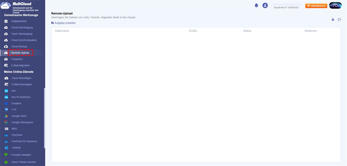 MultCloud bietet eine hervorragende Funktion: Remote-Upload. Die Nutzer können Online-Dateien von URLs, Magnet-Links, Torrent-Dateien usw. direkt ins Clouds und On-Premise-Diensten mit Remote-Upload speichern. Daher können Sie die folgende Schritt-für-Schritt-Anleitung befolgen, um herauszufinden, wie Sie Dateien über MultCloud direkt auf Cloud herunterladen können. Hier nehmen wir das Herunterladen von Web-Dateien auf Google Drive als Beispiel.