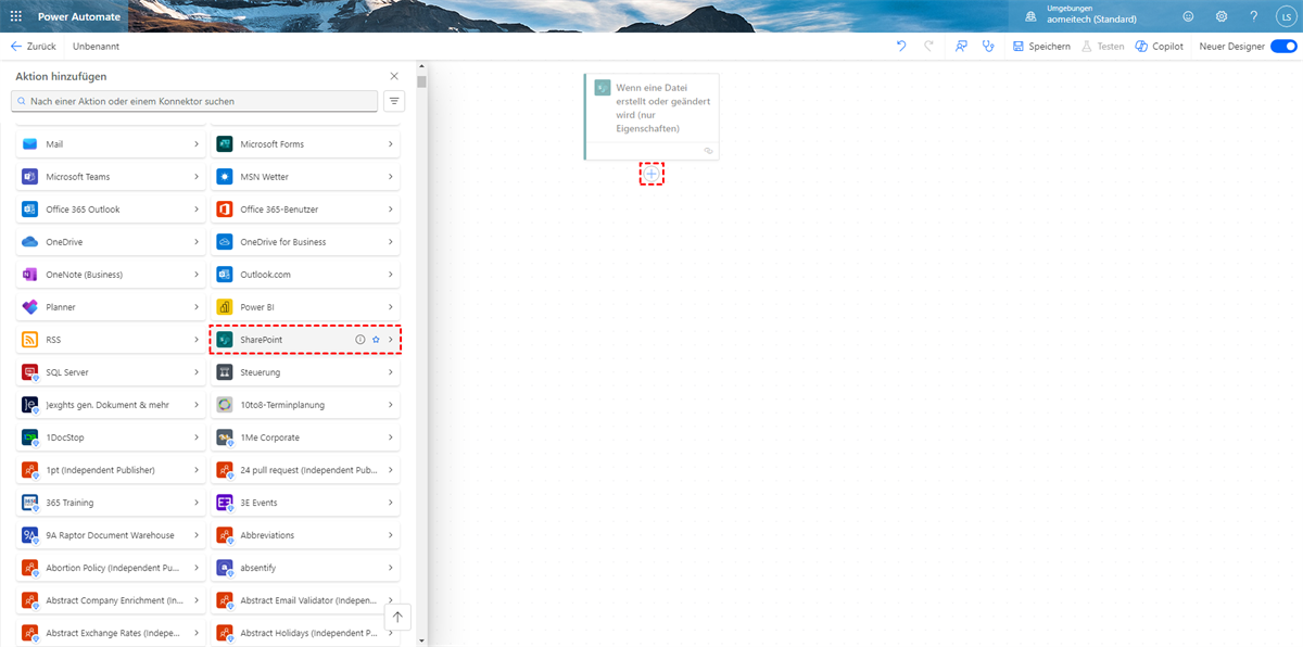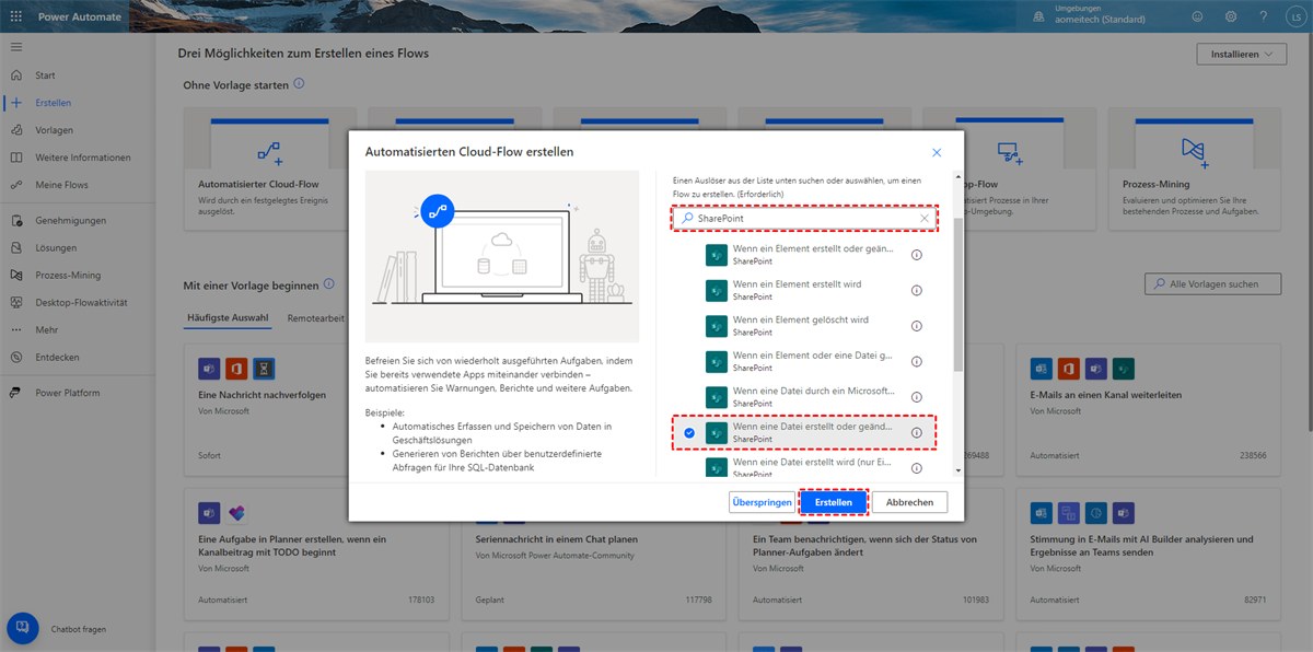 Schritt 3. Geben Sie „SharePoint“ in das Suchfeld ein und wählen Sie „Wenn eine Datei erstellt oder geändert wird“. Klicken Sie abschließend auf „Erstellen“.