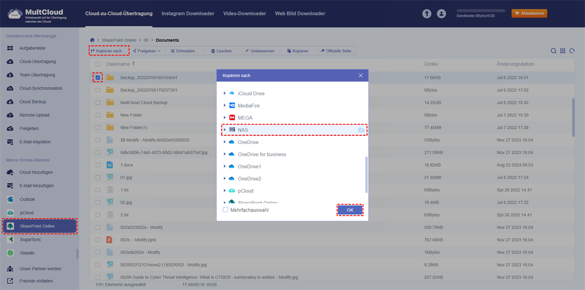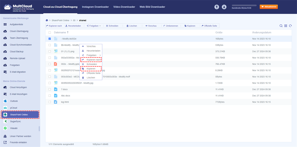 Es hat sich eine bessere Methode herauskristallisiert, bei der Sie zum Kopieren und Einfügen nicht mehrere Websites öffnen müssen: die Verwendung der Funktion „Kopieren nach“ von MultCloud. Sie müssen lediglich SharePoint und Geteilte Ablagen zu MultCloud hinzufügen und dann auf „Kopieren nach“ klicken, um Dateien von SharePoint auf Geteilte Ablagen zu verschieben. Die Bedienung ist ganz einfach und einen Versuch wert.