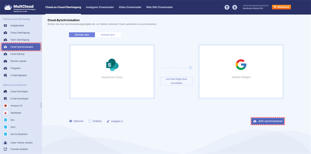 Es ist nicht schwierig, SharePoint mit Geteilte Ablagen zu synchronisieren, und Sie können dies auch über MultCloud realisieren. Mit der Cloud-Synchronisation müssen Sie nur diese 2 Clouds zu MultCloud hinzufügen und dann den Synchronisierungsprozess starten. Darüber hinaus können Sie bei Bedarf auch die Echtzeitsynchronisierung verwenden, um sicherzustellen, dass die SharePoint-Dateien kontinuierlich auf Ihrem Geteilte Ablagen aktualisiert werden.