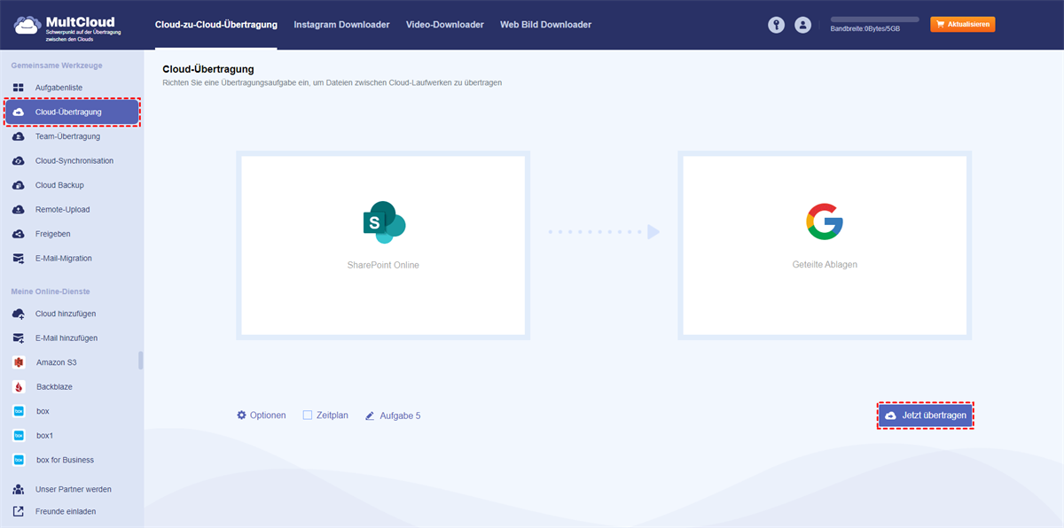 Um Dateien von SharePoint Online auf Geteilte Ablagen zu kopieren, können Sie „Cloud-Übertragung“ verwenden. Nachdem Sie ausgewählt haben, welche Dateien Sie übertragen möchten, klicken Sie auf die Schaltfläche „Jetzt übertragen“, um eine Übertragungsaufgabe zu erstellen. Während des Übertragungsvorgangs können Sie sogar Ihren Computer ausschalten, da MultCloud offline ausgeführt werden kann. Eine weitere Möglichkeit besteht darin, die Funktion „Kopieren nach“ zu verwenden. Sie können sie verwenden, um Dateien in SharePoint zu kopieren und sie dann in einem Netzlaufwerk oder Google Geteilte Ablagen einzufügen.