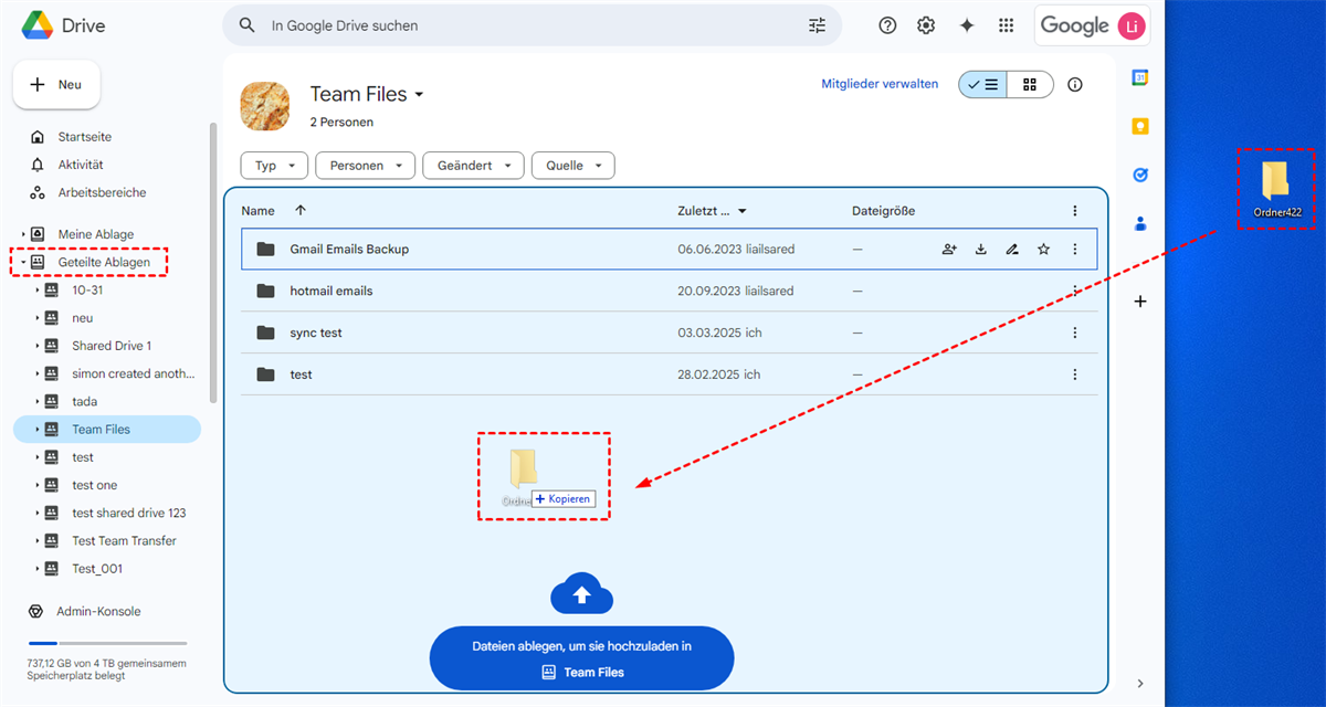 Schritt 2: Melden Sie sich bei Ihrem Google Geteilte Ablagen-Konto an und laden Sie die zuvor von SharePoint heruntergeladenen Dateien hoch.