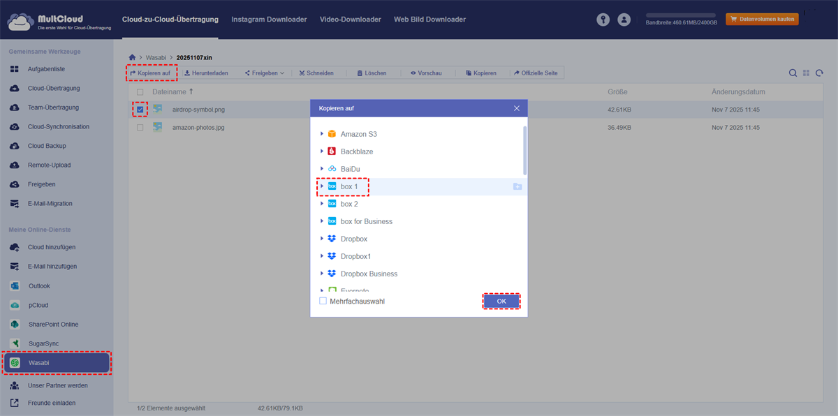 Löung 2: Dateien von Wasabi auf Box übertragen - mit MultCloud