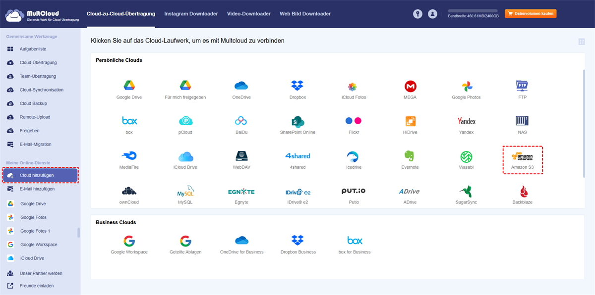 - MultCloud unterstützt über 40 Cloud-Dienste, darunter Amazon S3, SFTP/FTP/FTPS, Google Drive, Dropbox, OneDrive, Google Workspace, Gmail, Google Fotos, Dropbox Business, OneDrive for Business, iCloud Drive, iCloud Fotos, Outlook, MEGA, MediaFire und viele mehr.