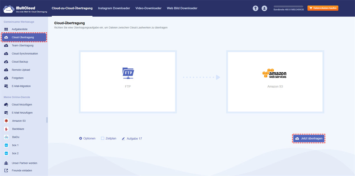 Nun zeigen wir Ihnen Schritt für Schritt, wie Sie mit MultCloud Daten von FTP zu S3 übertragen.