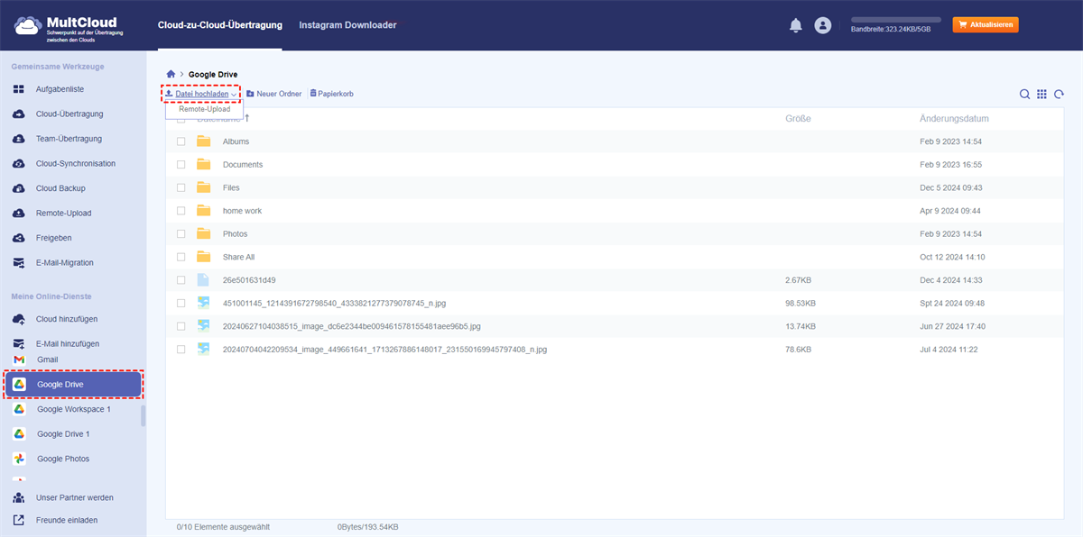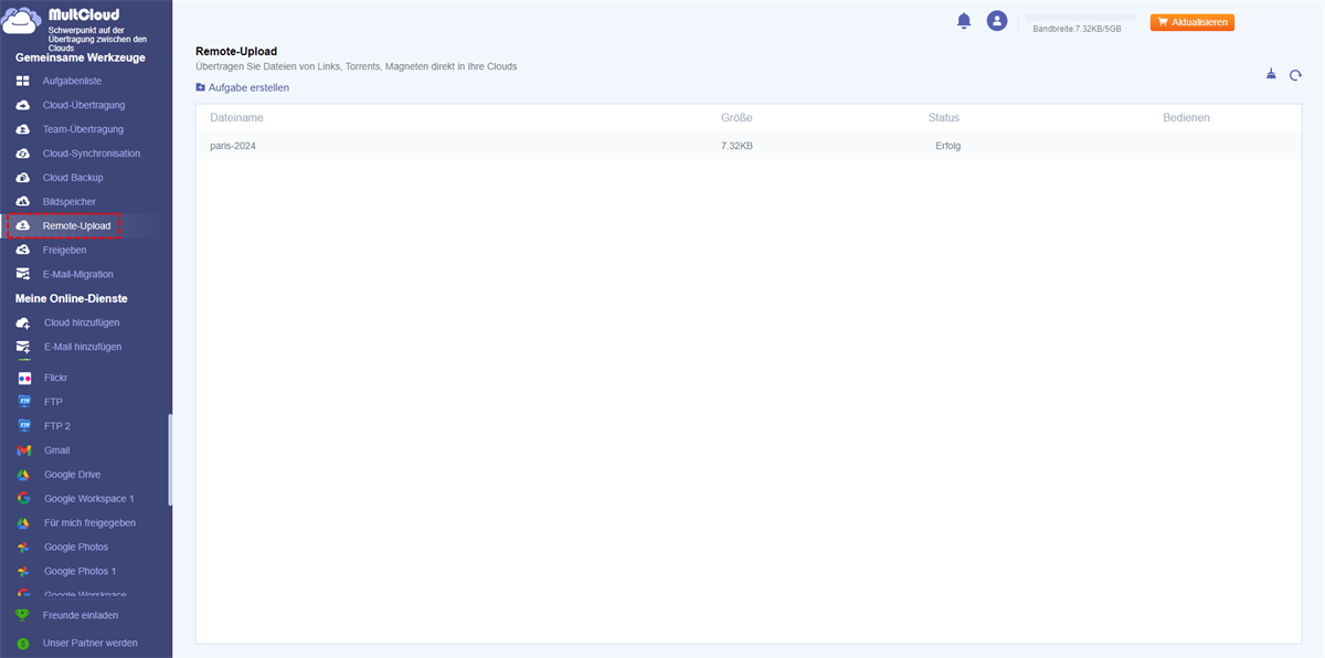 Mit Hilfe von MultCloud können Sie mit der Funktion „Remote-Upload” direkt auf Google Drive herunterladen.