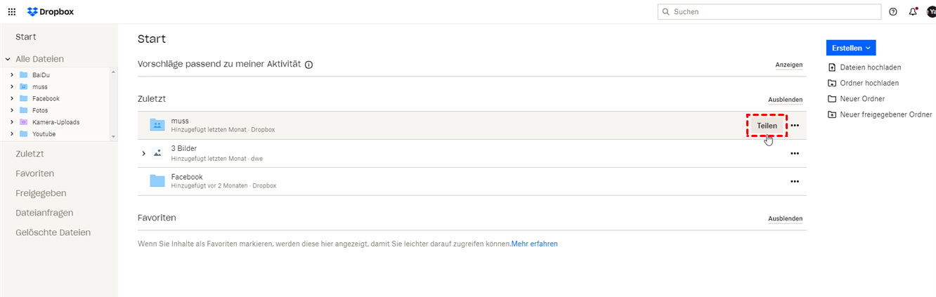 Schritt 1. Melden Sie sich in Ihrem Dropbox-Konto im Internet an, wählen Sie die Datei aus, die Sie freigeben möchten, und klicken Sie auf „Teilen”.