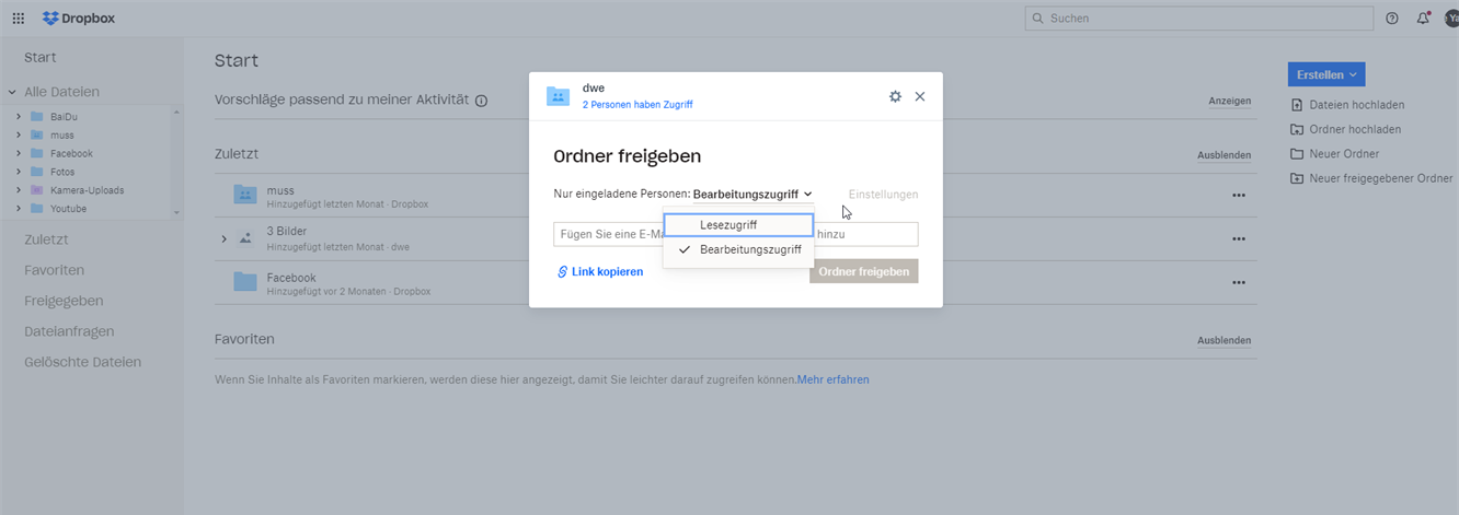 Wie kann man Dokumente in Dropbox hochladen und teilen? Ich gratuliere Ihnen, dass Sie gelernt haben, wie Sie Dateien in Dropbox hochladen können. Aber wie kann man Dropbox zum Teilen von Dateien verwenden? Keine Sorge! Wir bieten Ihnen 2 gängige Möglichkeiten zum Hochladen und Freigeben von Dateien in Dropbox: die eine ist das Freigeben von Dateien per E-Mail, die andere das Freigeben von Dateien durch Senden eines Links.