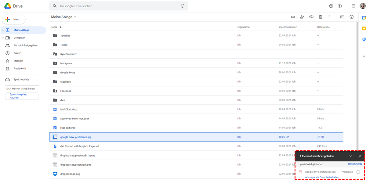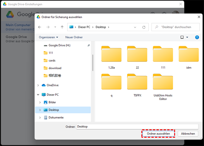 Hinweis: Alternativ können Sie den Google Drive-Ordner im Datei-Explorer Ihres Computers öffnen und dann die Dateien und Ordner, die Sie hochladen möchten, per Drag & Drop in diesen Google Drive-Ordner ziehen.