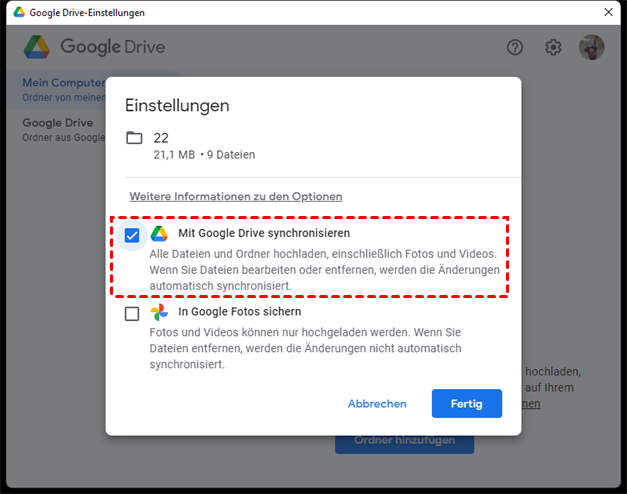 Schritt 6. Wählen Sie im folgenden Pop-up-Fenster die Option „Mit Google Drive synchronisieren”, und die Google Drive-Desktop-Anwendung lädt alle Ihre Dateien und Ordner, einschließlich Fotos und Videos hoch. Wenn Sie diese Dateien oder Ordner bearbeitet oder gelöscht haben, werden diese Änderungen automatisch aktualisiert und synchronisiert.