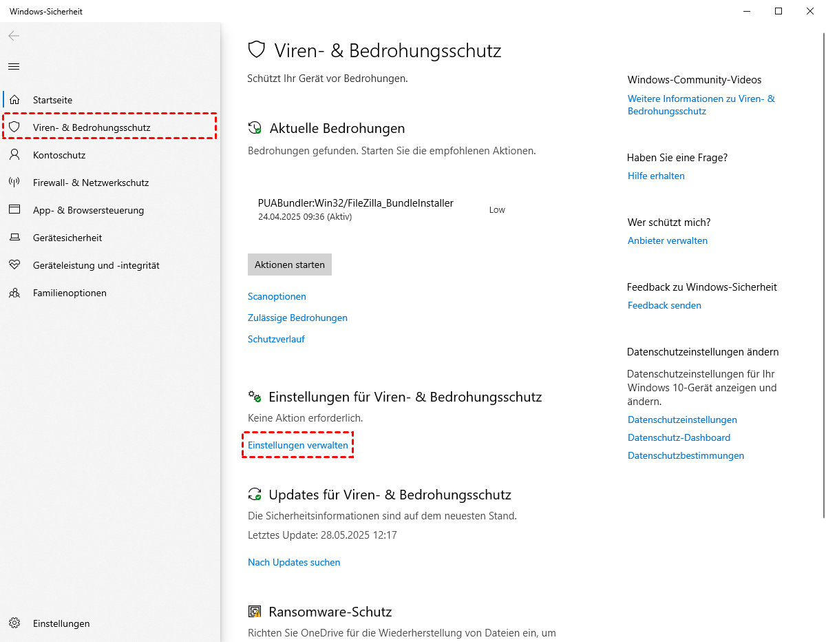 Schritt 2. Gehen Sie zu Update & Sicherheit > Windows-Sicherheit > Virens- & Bedrohungsschutz > Einstellungen für Virenschutz und Bedrohungsschutz > Einstellungen verwalten.
