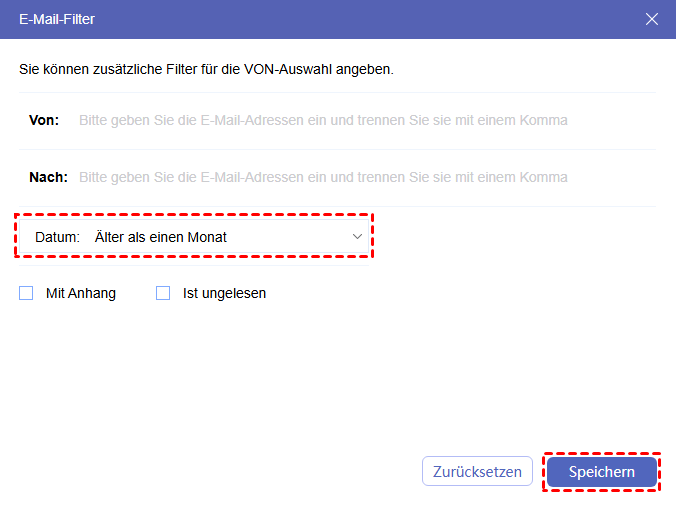 4. Klicken Sie auf E-Mail-Filter > Datum: Benutzerdefinierter Zeitraum > Älter als einen Monat > Speichern.