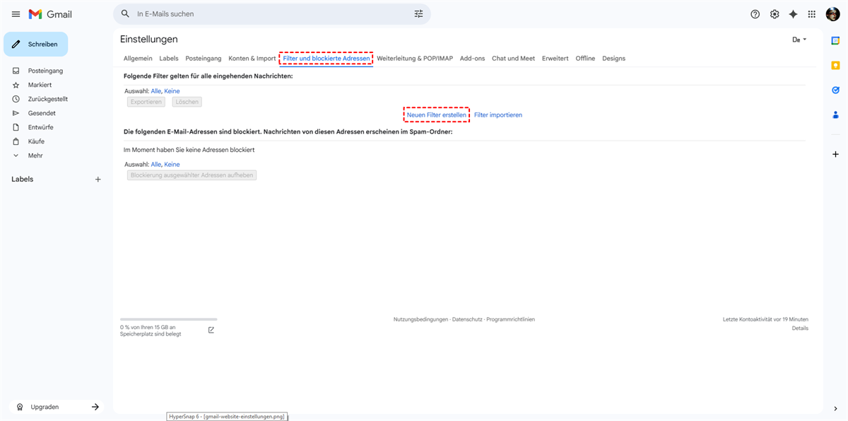 3. Gehen Sie zum Tab „Filter und blockierte Adressen“ und klicken Sie auf „Neuen Filter erstellen“. Hier können Sie festlegen, welche E-Mails automatisch archiviert werden sollen.