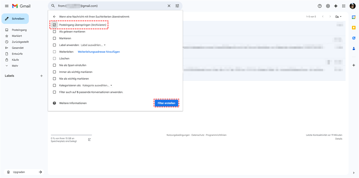 6. Senden Sie nach der Implementierung des Filters eine Test-E-Mail, die den gewählten Kriterien entspricht. Die E-Mail landet, wenn alles planmäßig verläuft, direkt im Archiv und nicht in Ihrem Posteingang.
