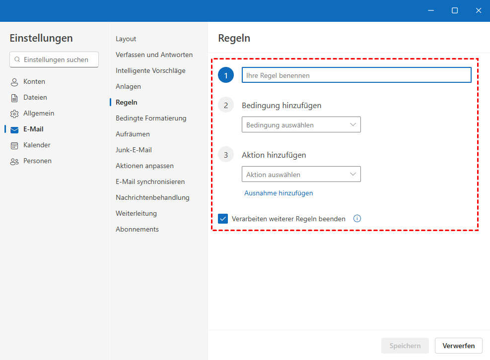 4. Legen Sie Bedingungen fest (z. B. Betreff enthält „Rechnung“).
