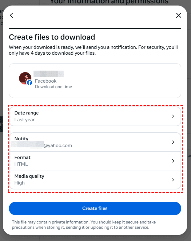 Schritt 5: Klicke auf „Dateien erstellen“ und warte, bis Facebook deine Daten generiert hat.