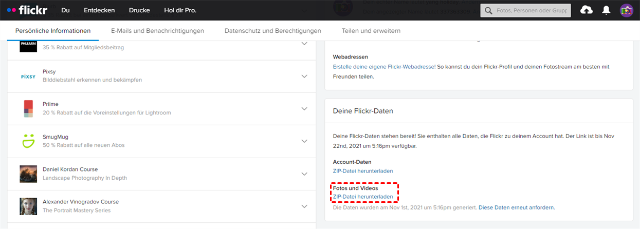Schritt 3. Gehen Sie zur Schnittstelle „Persönliche Informationen” und klicken Sie auf „Meine Flickr-Daten anfordern” in der Auswahl „Deine Flickr-Daten”.