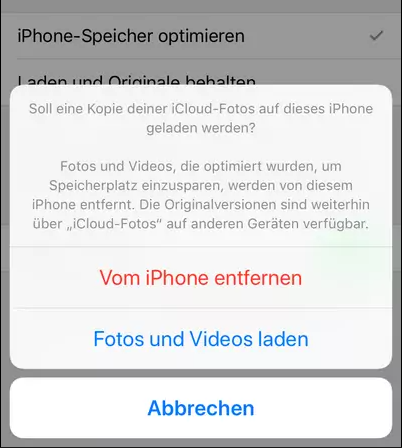 Hinweis: iPhone-Speicher optimieren bedeutet, dass iCloud alle Ihre Originalfotos im Format mit voller Auflösung behält und Ihr iPhone nur kleinere Versionen in Gerätegröße speichert, um weniger iPhone-Speicher zu verbrauchen. Überprüfen Sie die Unterschiede zwischen iPhone-Speicher optimieren und Original herunterladen und behalten.