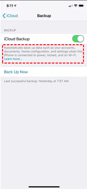 - Wenn Sie die Informationen unter iCloud Backup sehen, die Folgendes anzeigen: Automatically back up data such as your accounts, documents, Home configuration and settings when this iPhone is connected to power, locked, and on Wi-Fi. Das bedeutet, dass iCloud Backup Ihre Fotos nicht auf Ihrem iPhone sichert. Sie müssen die Fotos zuerst auf iCloud Fotos überprüfen.