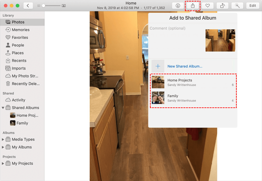 Schritt 5: Klicken Sie oben auf dem Bildschirm auf das Teilen-Symbol (Quadrat mit einem nach oben zeigenden Pfeil). Wählen Sie im Dropdown-Menü „Geteilte Alben“ aus, klicken Sie auf das Album, zu dem Sie die Fotos hinzufügen möchten, und wählen Sie die gewünschten Fotos aus (oder halten Sie die Umschalt- oder Befehlstaste gedrückt, um mehrere Fotos auszuwählen).