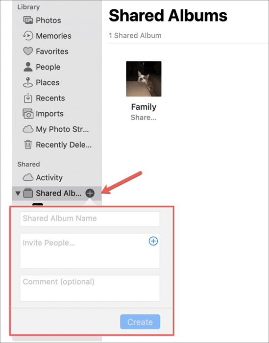 Schritt 4: Öffnen Sie die App „Fotos“. Bewegen Sie den Mauszeiger im linken Menü über „Geteilte Alben“ und klicken Sie auf das [+]-Symbol. Geben Sie Ihrem Album einen Namen, laden Sie Personen ein und fügen Sie bei Bedarf Kommentare hinzu. Klicken Sie anschließend auf „Erstellen“.