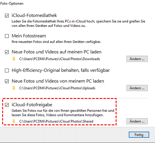 Schritt 2: Aktivieren Sie das Kontrollkästchen „iCloud-Fotofreigabe“. Klicken Sie auf „Fertig“ und dann auf „Übernehmen“.