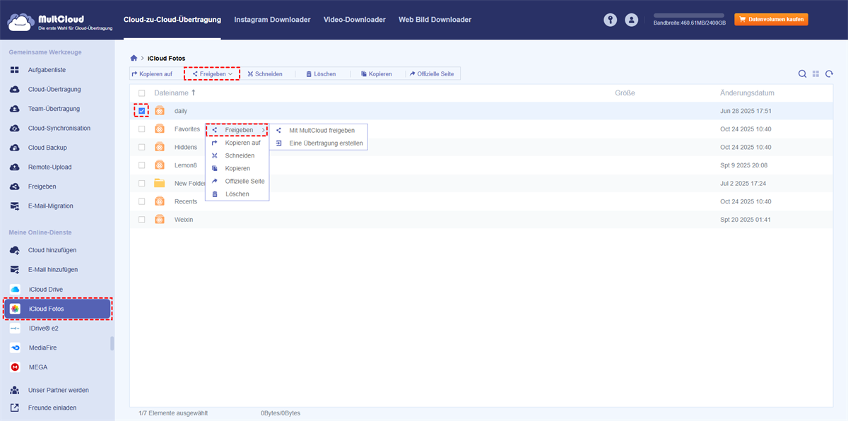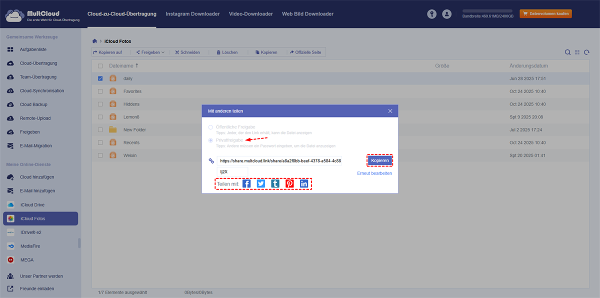 Wie kann man also iCloud Fotos sicher über die „Privatfreigabe“ von MultCloud teilen? Überprüfen Sie die folgenden einfachen Schritte: