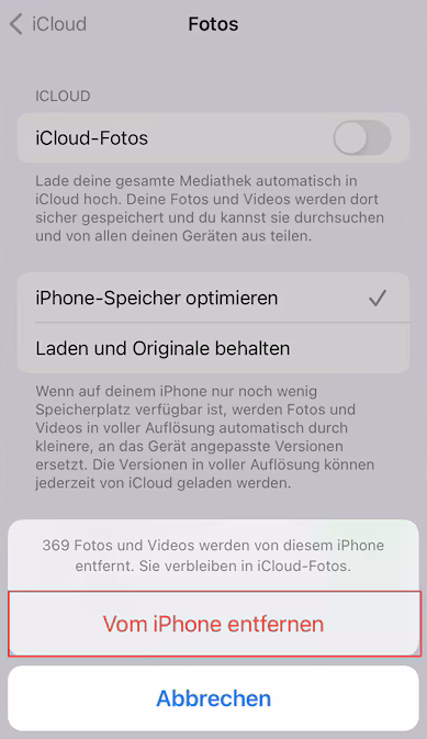6. Schriff: Wenn Sie zuvor Fotos in die iCloud geladen haben, werden Sie im Anschluss gefragt, ob Sie die Fotos aus der iCloud auf dem Gerät behalten oder löschen möchten.