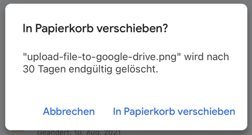 Im Hinblick auf die Datensicherheit stellt Google Drive Ihnen einen speziellen Ordner namens „Papierkorb” auf der Website und „Papierkorb” in der mobilen App zur Verfügung. Die Fotos und anderen Dateien, die Sie zum ersten Mal aus Google Drive gelöscht haben, werden für maximal 30 Tage sicher im Mülleimer aufbewahrt.