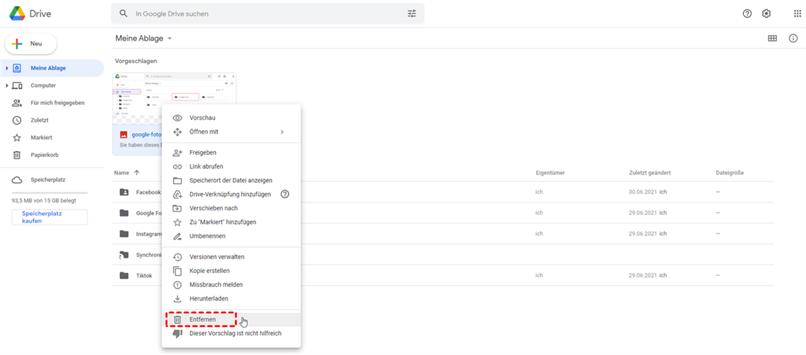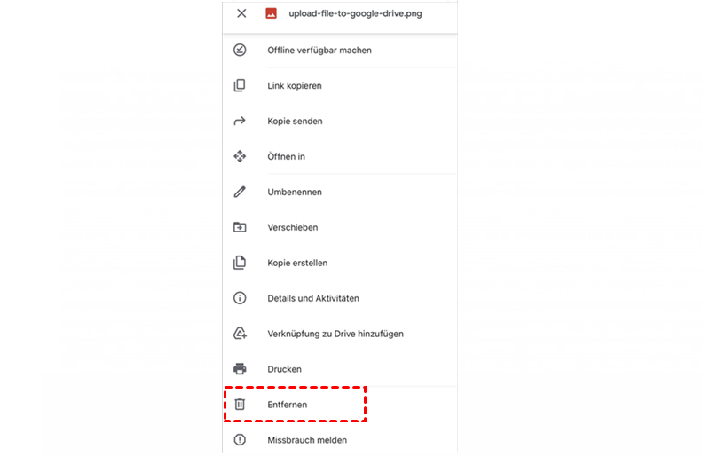 Schritt 3. Klicken Sie im Pop-up-Menü auf „Entfernen”. Dann sind die Fotos in Ihrem Google Drive verschwunden.