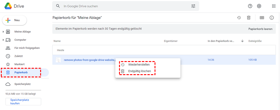Da Google Drive einer der besten Cloud-Speicherdienste weltweit ist, wird den unterschiedlichen Erfahrungen und Anforderungen der Nutzer große Aufmerksamkeit geschenkt. Daher bietet Google Drive in der Menüleiste den Punkt „Papierkorb” an, um Ihre gelöschten Dateien 30 Tage lang sicher aufzubewahren, falls Sie versehentlich gelöschte Fotos oder andere Dateien, die Ihnen wichtig sind, wiederherstellen möchten.