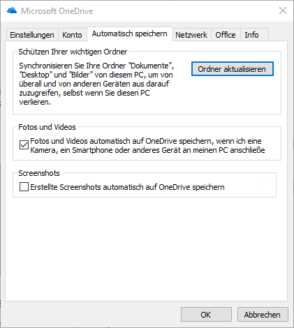 - Sie können Screenshots automatisch sichern, indem Sie „Erstellte Screenshots automatisch auf OneDrive speichern” markieren.
