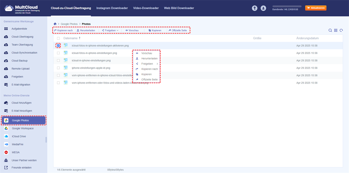 Wenn Sie Fotos in iCloud flexibler verwalten und auf andere Cloud-Speicherplattformen übertragen möchten, können Sie ein Tool wie MultCloud ausprobieren, mit dem Sie Fotos bequem plattformübergreifend verwalten können. MultCloud unterstützt mehr als 30 gängige Cloud-Speicherdienste, darunter Dropbox, Google Drive, iCloud Drive, OneDrive usw. Benutzer können Dateien problemlos plattformübergreifend verwalten und Datenmigration, -synchronisierung und -sicherung zwischen Clouds durchführen.