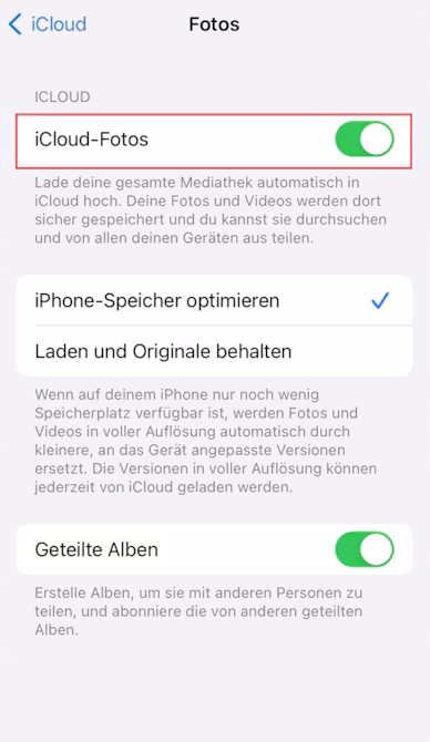 6. Schritt: Aktivieren Sie die Option iPhone-Speicher optimieren. Nach der Aktivierung behält Ihr iPhone nur Fotos und Videos mit niedriger Auflösung, während die ursprünglichen Dateien mit hoher Auflösung in iCloud gespeichert werden.